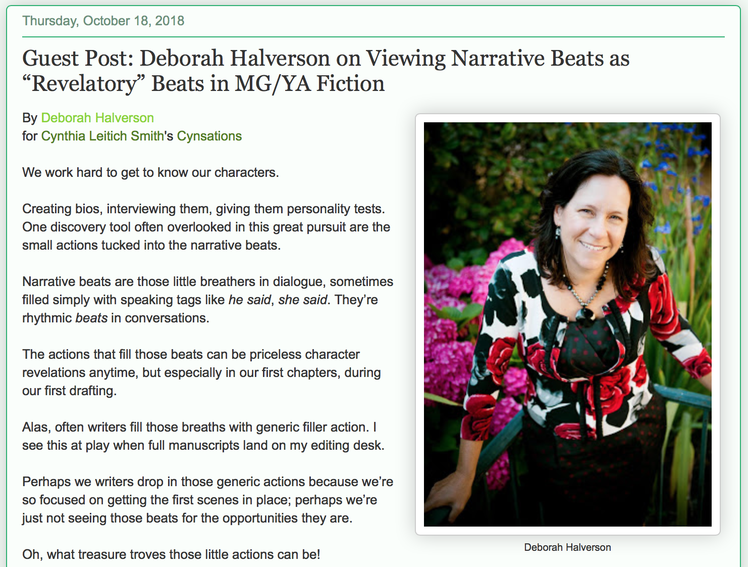 I’m honored to be a Guest Blogger on the amazing Cynsations blog today, with my post “Deborah Halverson on Viewing Narrative Beats as ‘Revelatory’ Beats in MG/YA Fiction.” There so much power and potential in those moments between lines of dialogue — the beats. I explore that in the guest post. Here’s a snippet: “Perhaps we writers drop in those generic actions because we’re so focused on getting the first scenes in place; perhaps we’re just not seeing those beats for the opportunities they are. ‘Oh, what treasure troves those little actions can be!’“