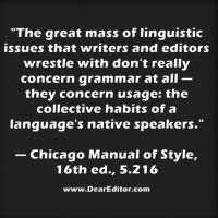 I was perusing the 16th edition of The Chicago Manual of Style this weekend, as editors are wont to do, when I noticed this statement: “The great mass of linguistic issues that writers an editors wrestle with don’t really concern grammar at all–they concern usage: the collective habits of a language’s native speakers.” (5.216) This spoke to […]